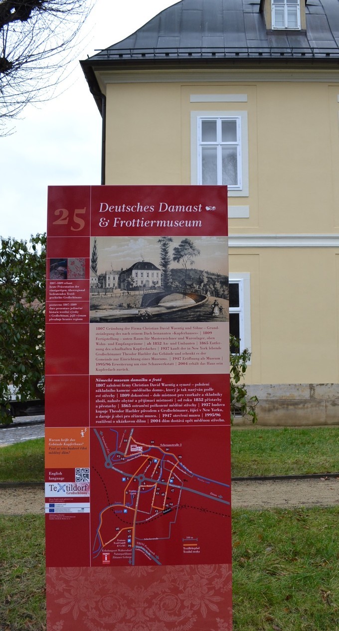 Seine jahrhundertealte Textiltradition hat das Antlitz und die Wirtschaft von Großschönau geprägt. In dem idyllisch am Fuße des Zittauer Gebirges gelegenen Dorf wurde 1666 erstmalig in Deutschland Damast gewebt, ein exklusives Bildgewebe, das schnell zum weltbekannten Luxusgut werden sollte. Ebenfalls von Großschönau ausgehend verbreitete sich ab 1865 ein weiteres besonderes textiles Herstellungsverfahren in ganz Deutschland: die Frottierweberei. Bis heute sind kuschelweiche Handtücher, Waschlappen und Bademäntel aus dem Textildorf Großschönau auf dem Weg in die Welt. Dieser besonderen textilen Geschichte und Gegenwart des Ortes können die Besucher Großschönaus auf dem „Textilpfad“ buchstäblich auf die Spur kommen. Insgesamt 30 Informationsstelen laden dazu ein, wichtige mit der Textiltradition verbundene Stationen des Ortes zu entdecken. Dazu gehören neben Fabrikantenvillen, (ehemaligen) Fabriken und Weberhäusern auch die Wohnorte bzw. Wirkungsstätten berühmter Großschönauer Persönlichkeiten. In deutscher und tschechischer Sprache verfasste historische Fakten sind auf den Informationsstelen ebenso zu finden wie historische Aufnahmen oder Reproduktionen archivalischer Dokumente. Auf diese Weise wird ein Stück der lokalen Vergangenheit für die Betrachter in die Gegenwart geholt. Und auch an die jüngeren Forscher wurde gedacht: kleine Rätsel laden zum genauen Lesen der Texte ein.